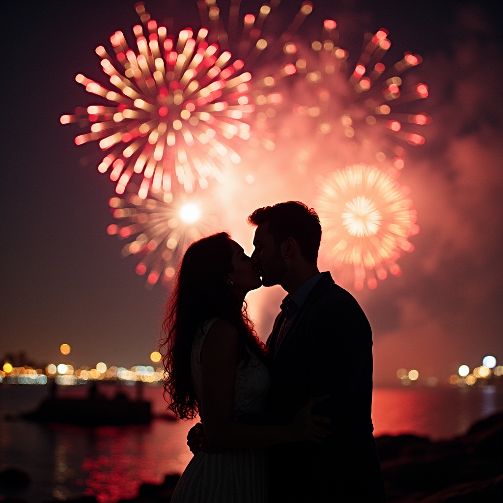 background, celebration, city, colorful, couple, event, fireworks, happiness, holiday, kiss, love, night, outdoor, people, romance, scene, silhouettes, sky, together, water