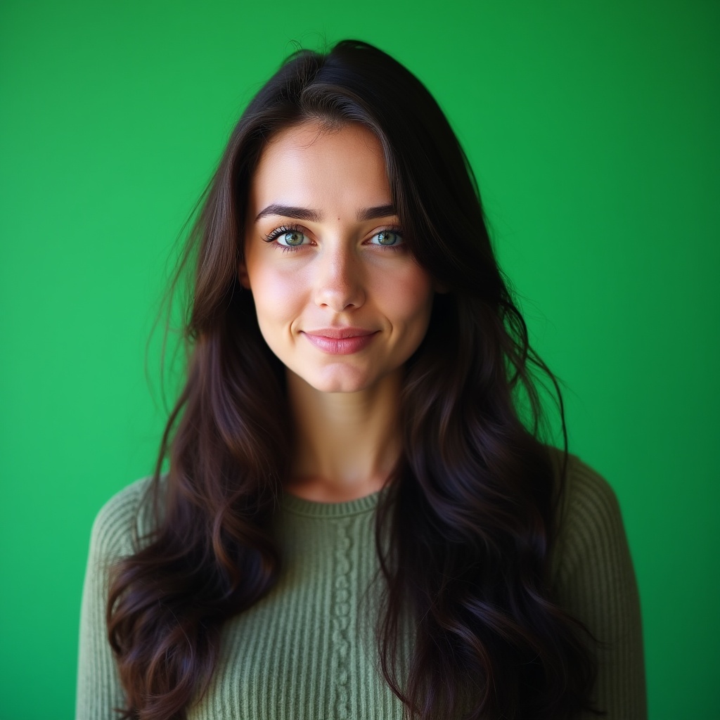 A young woman stands against a green backdrop. She has long, dark hair and bright blue eyes. Her expression is friendly and approachable.