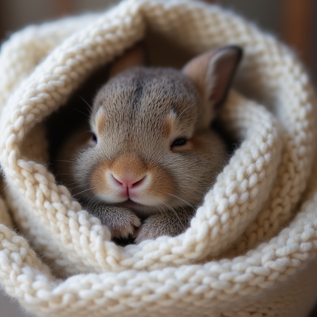 animal, blanket, brown, close-up, cozy, cuteness, domestic, fur, home, indoor, peaceful, pet, rabbit, resting, sleep, small, snuggle, soft, warmth, winter