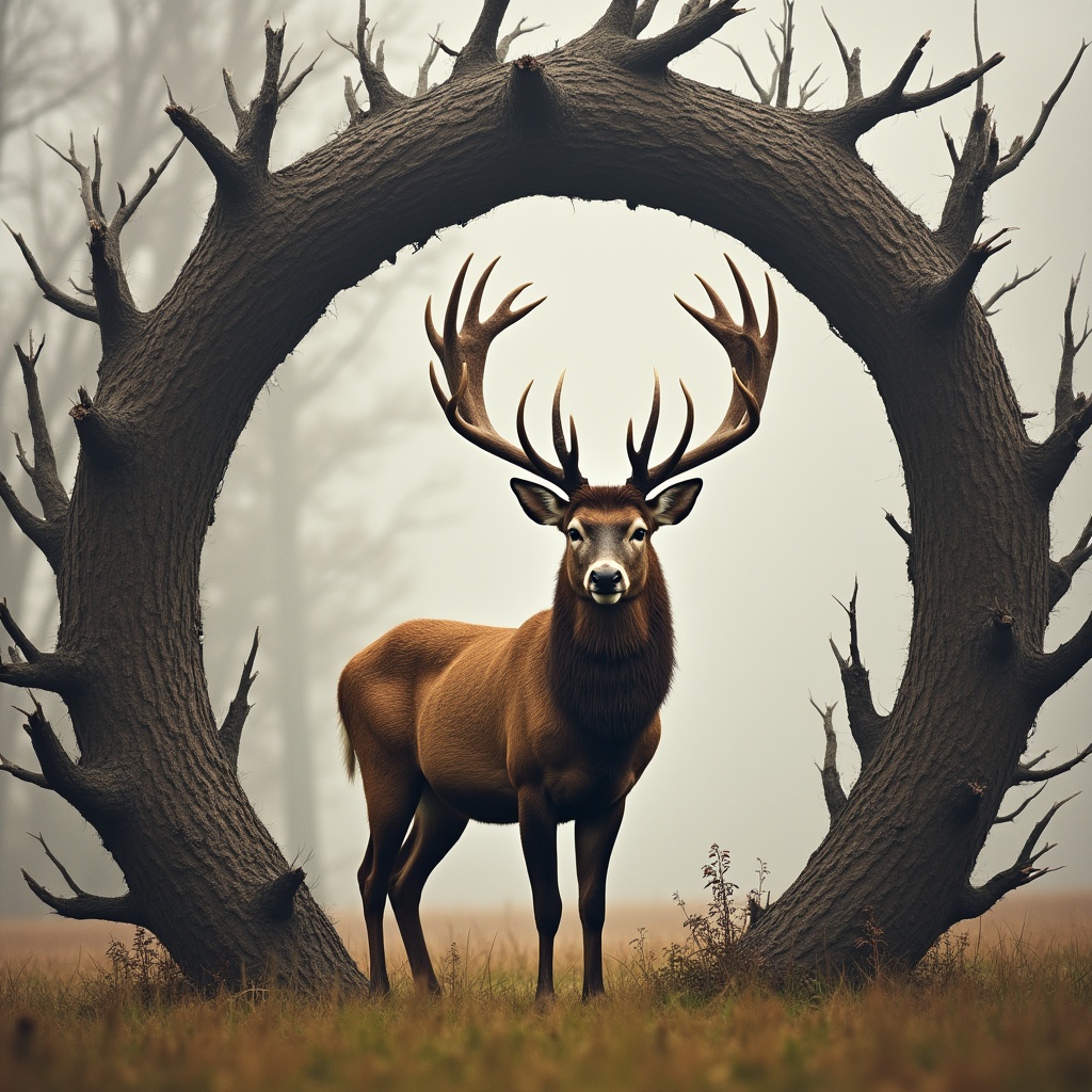 A stag stands calmly in front of a large tree arch. Fog surrounds the area, creating a misty atmosphere.
