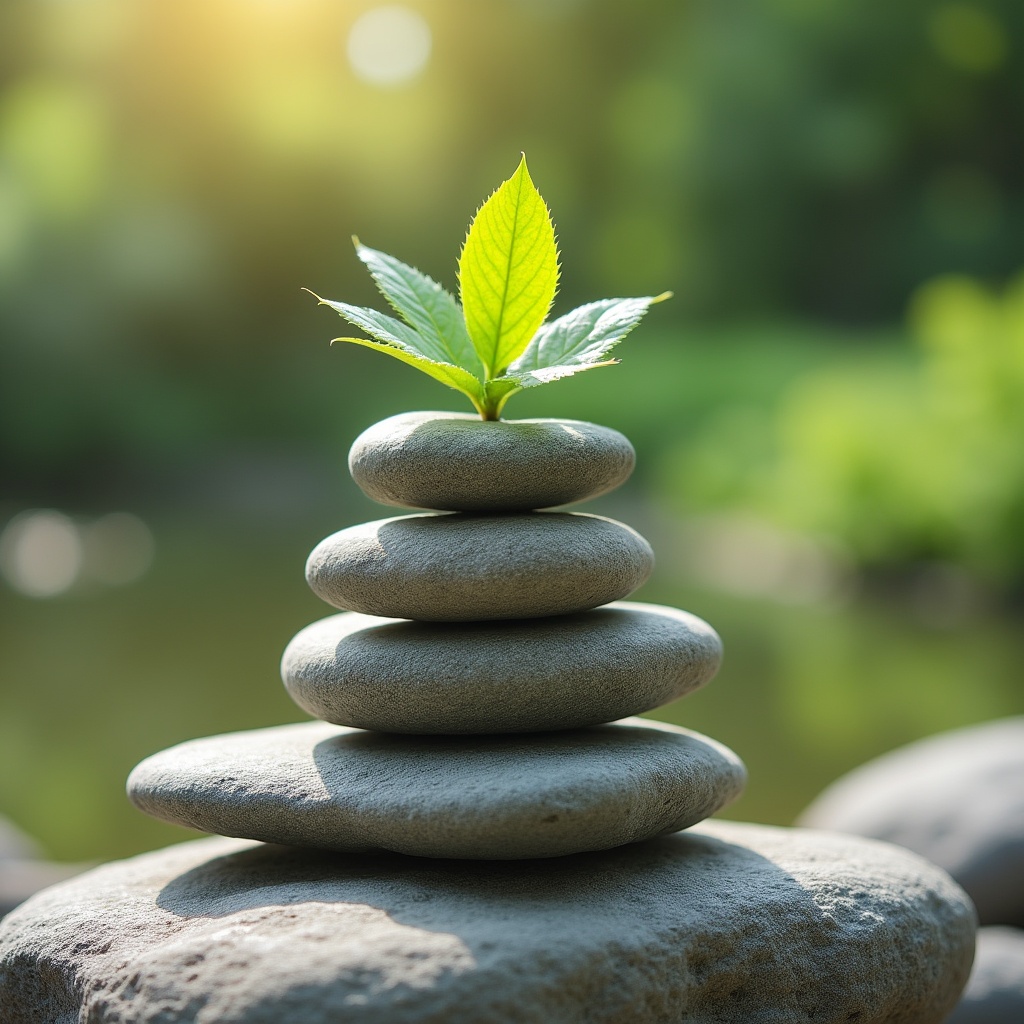 Four stones stacked with a green leaf on top, placed by a body of water in a natural setting. Sunlight shines softly on the scene.
