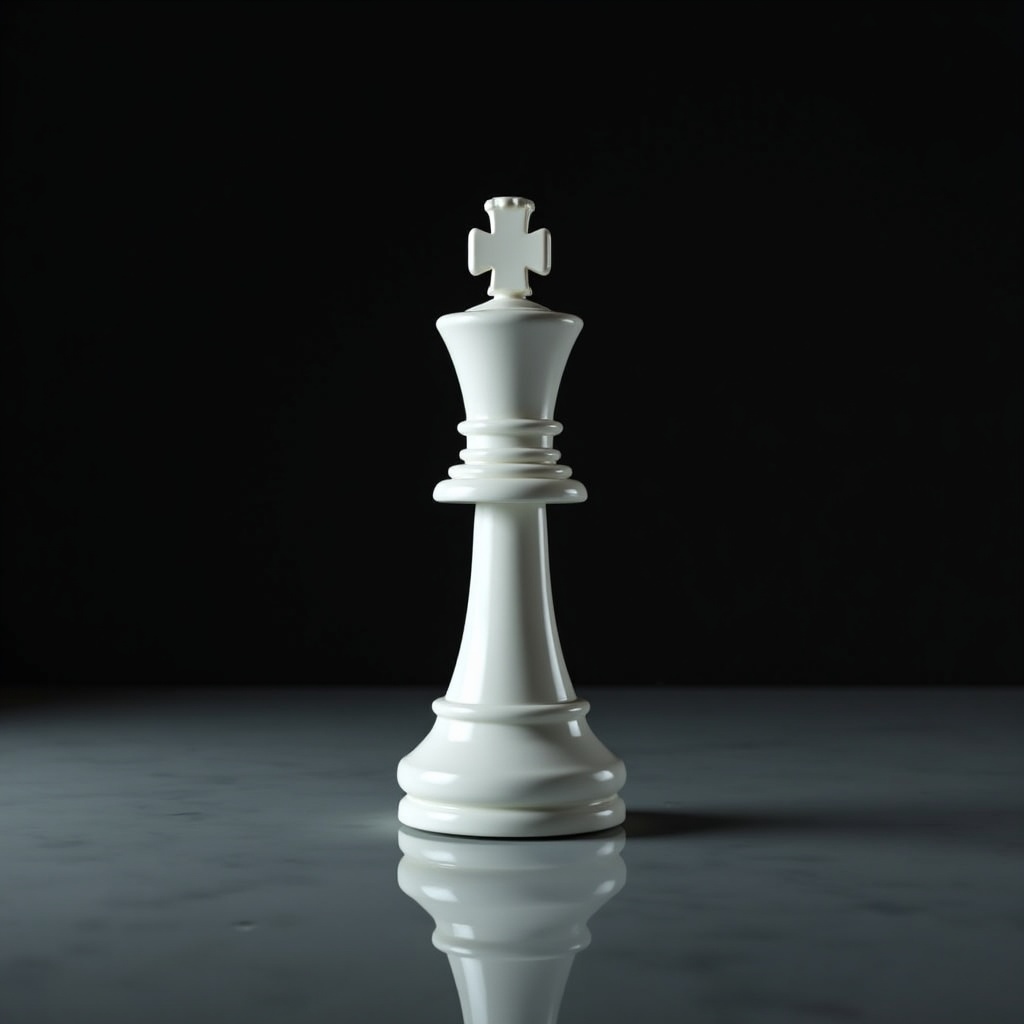 A white king chess piece is placed on a dark surface. The piece reflects light, emphasizing its shape against the shadowy background.