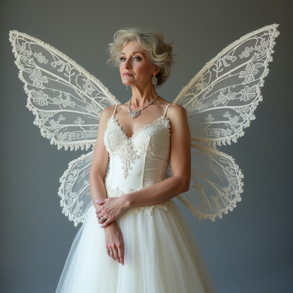 A woman stands still with butterfly wings made of lace. Her hair is styled elegantly. She wears a white gown and jewelry.