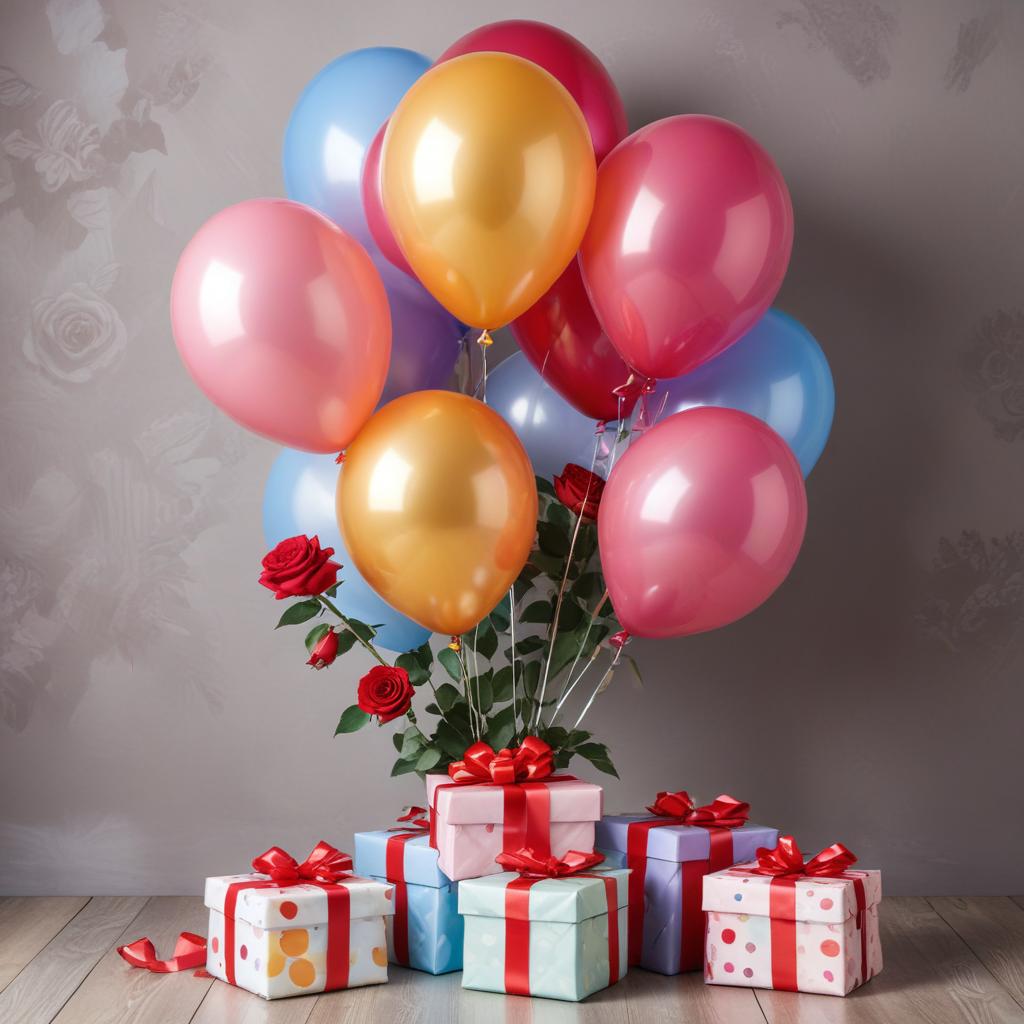 Balloons in various colors are arranged with presents wrapped in colorful paper. Nearby, roses are placed to add a festive touch.