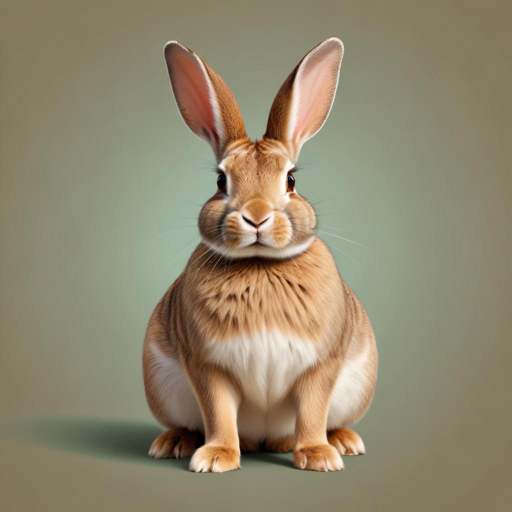 A rabbit with long ears sits calmly on a flat surface. Its fur is light brown with a white belly. The background color is soft.