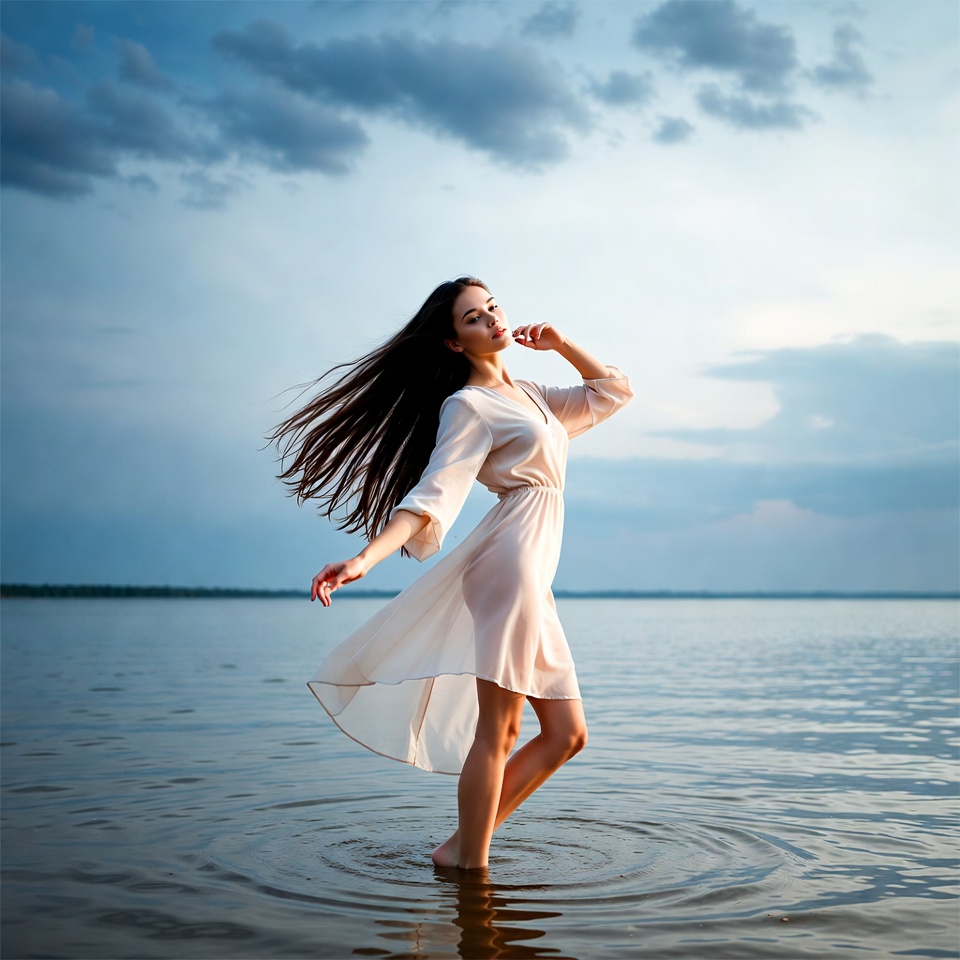 beauty, breeze, calm, carefree, clouds, dress, evening, fashion, hair, joy, lake, movement, nature, outdoors, reflection, sky, standing, summer, water, woman