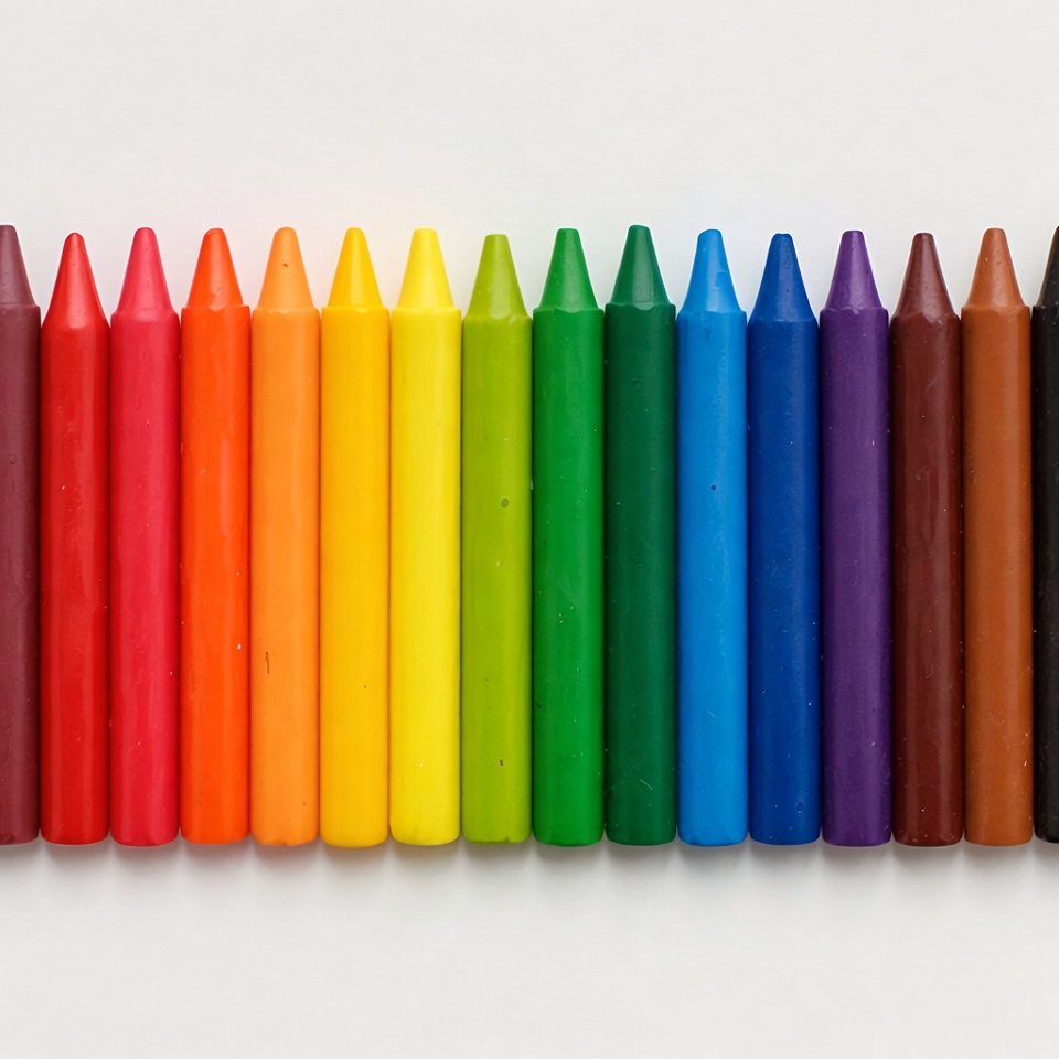 A set of crayons is lined up in rainbow order on a white surface. The colors range from red to purple. This setup invites creative use.