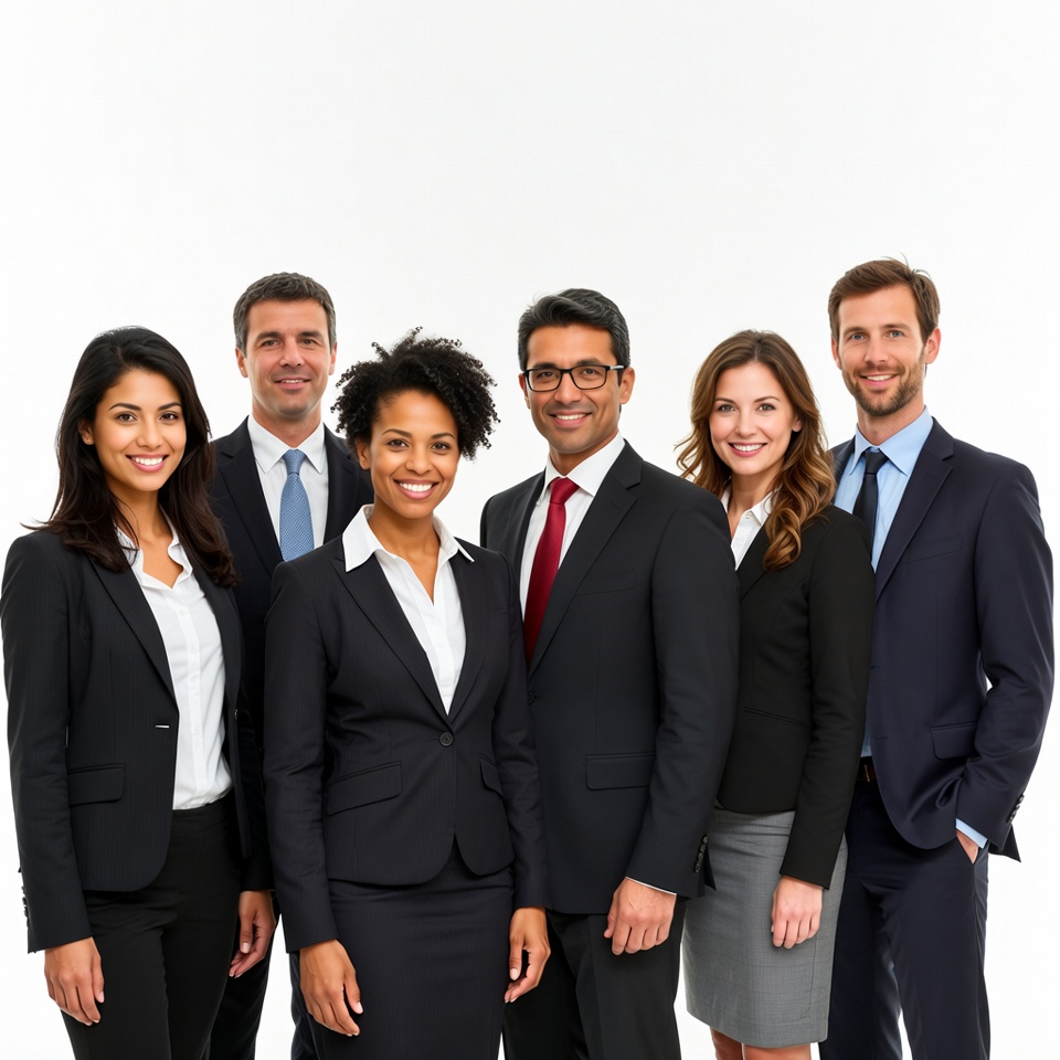 Group of six business professionals standing side by side in a studio. They are dressed in suits.