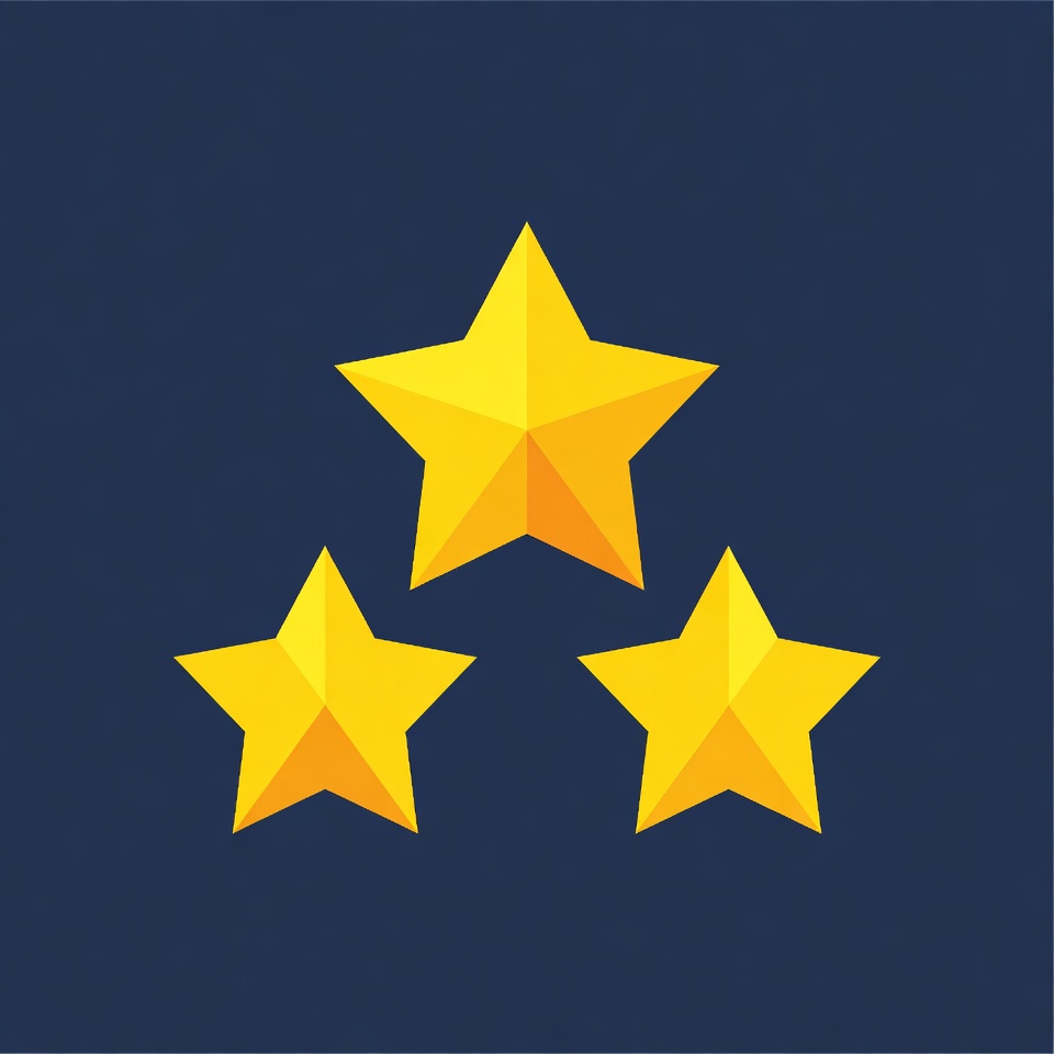 Three yellow stars are arranged in a triangular shape. They sit on a dark blue background. The stars have a simple design with sharp angles.