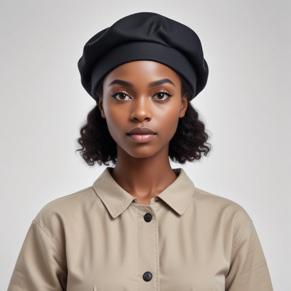 A person stands indoors wearing a black hat and a beige shirt. The background is plain and simple. The person's expression is neutral.