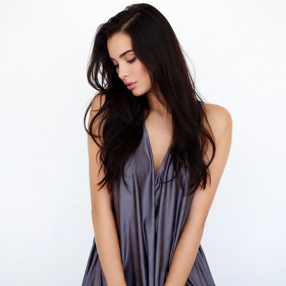 A woman stands with her head slightly down, wearing a sleeveless dress. The background is plain, and her hair flows down.