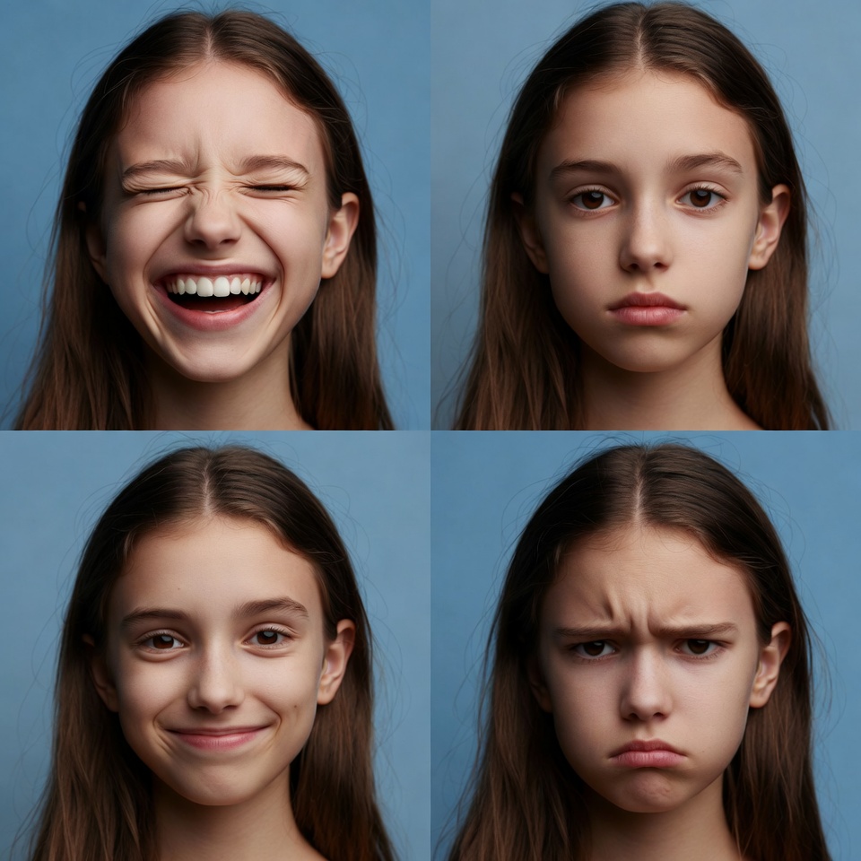 A young girl shows different facial expressions, including joy, sadness, and neutrality. The background is plain blue.