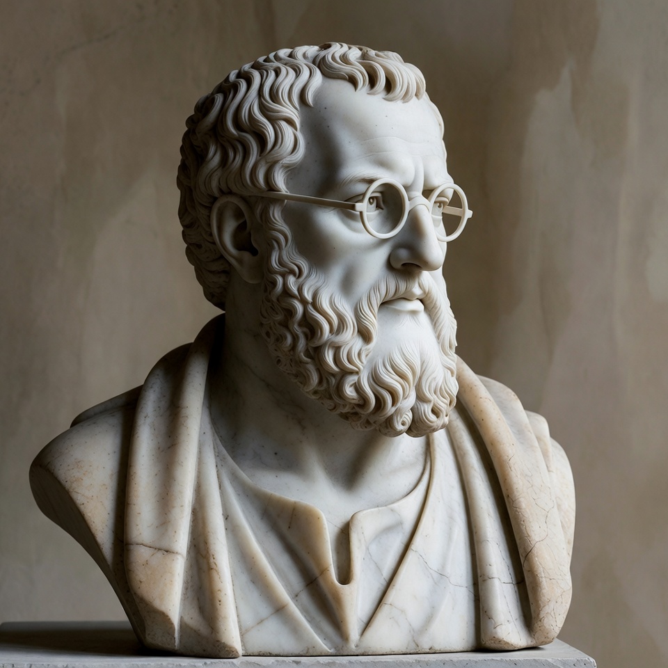 art, beard, bust, classical, craftsmanship, culture, details, display, facial features, figure, glasses, heritage, historic, lighting, marble, museum, portrait, scholar, sculpture, stone