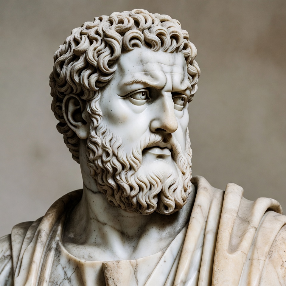 A detailed depiction of a bearded man. The art captures facial features and clothing style from ancient Rome.