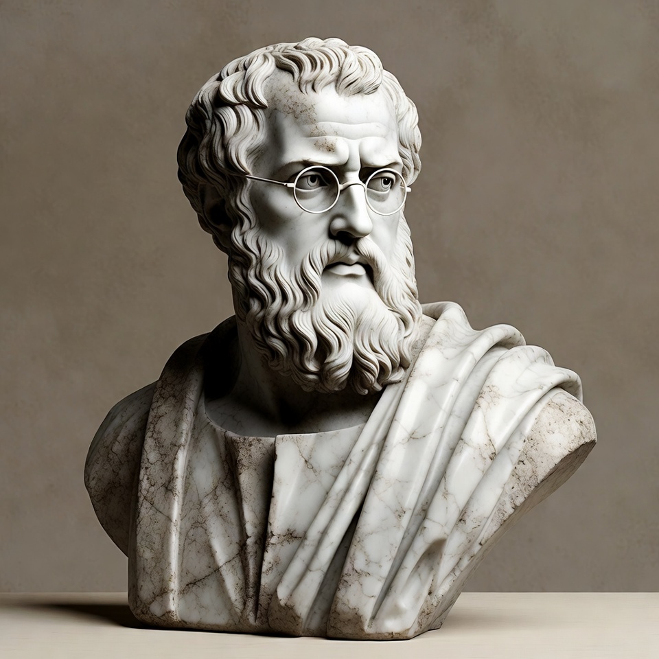 A marble bust shows a philosopher with glasses and a beard. It stands against a plain background, highlighting its details and craftsmanship.