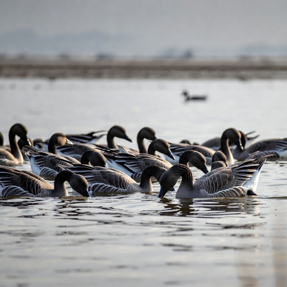 Birds gather to feed in shallow water on a cloudy day. They dip their heads and search for food in the water.