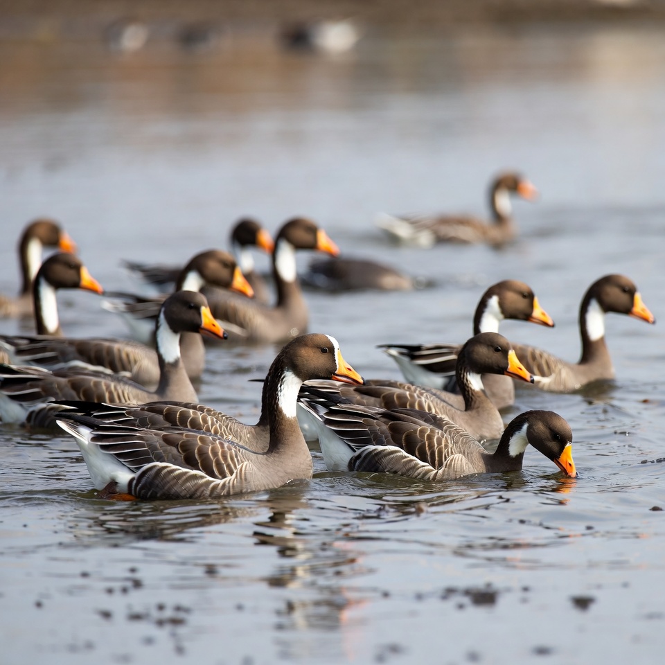 activity, animals, birds, day, environment, feathers, geese, group, habitat, nature, orange, outdoors, pond, reflection, ripples, swimming, water, waterfowl, wetland, wildlife