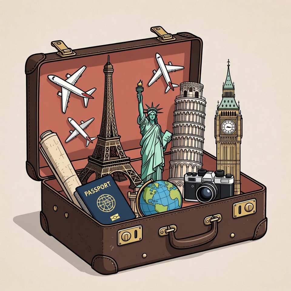 A suitcase contains a passport, globe, camera, and famous landmarks like the Eiffel Tower and Big Ben, symbolizing travel.