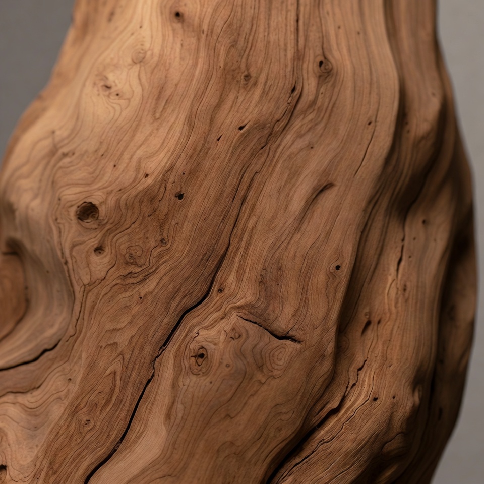 Detailed view of a piece of wood showing unique grain patterns and textures. The image highlights the natural design and warmth of the wood.