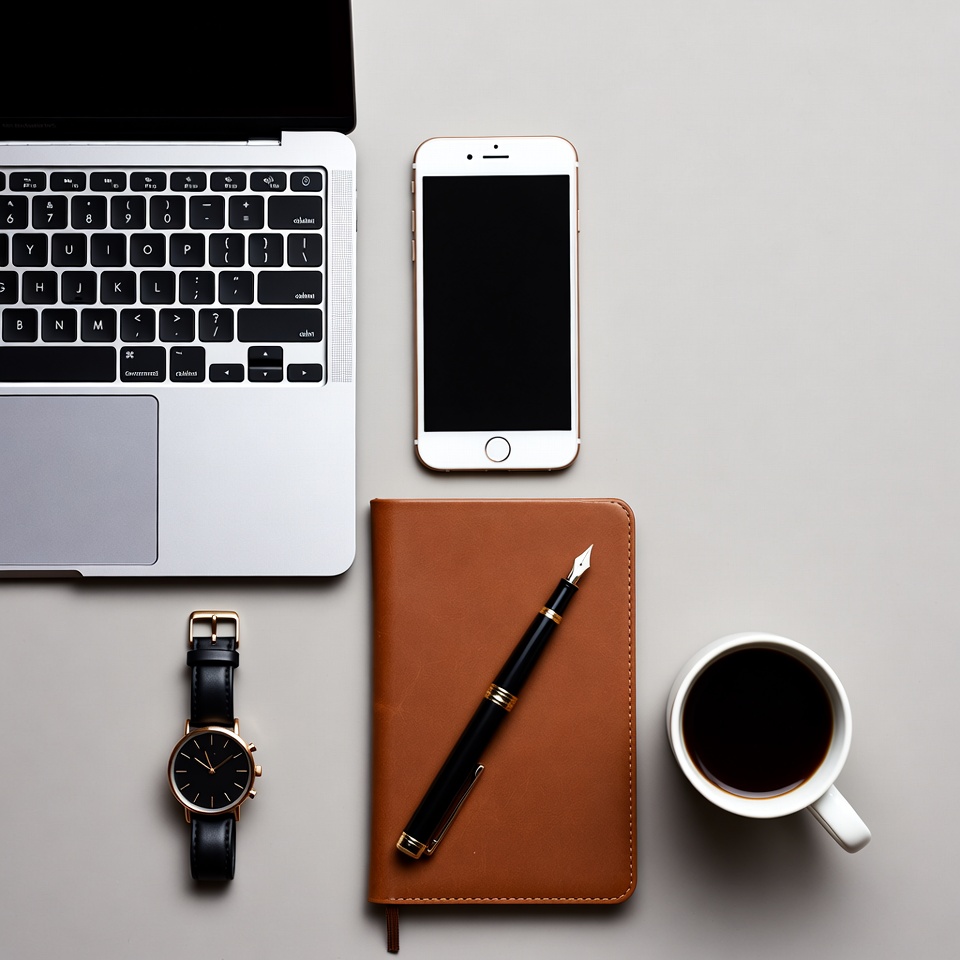 casual, coffee, desk, items, laptop, leather, mug, notebook, office, organization, pen, phone, productivity, routine, technology, time management, watch, working, workspace, writing