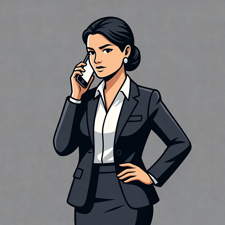 A woman in a suit speaks on a phone while standing confidently. She has a professional look with a modern hairstyle.