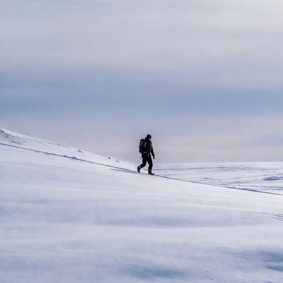 activity, adventure, clouds, cold, exploration, frozen, hiking, landscape, nature, outdoor, person, snow, snowfield, solitude, terrain, travel, walking, weather, wilderness, winter