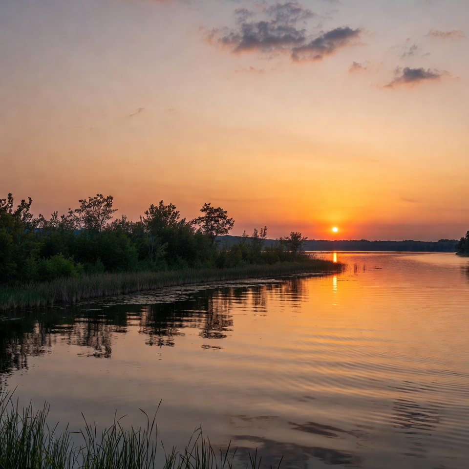 Sun sets behind trees by the water, creating reflections on the surface. The sky shows warm colors as the day ends.