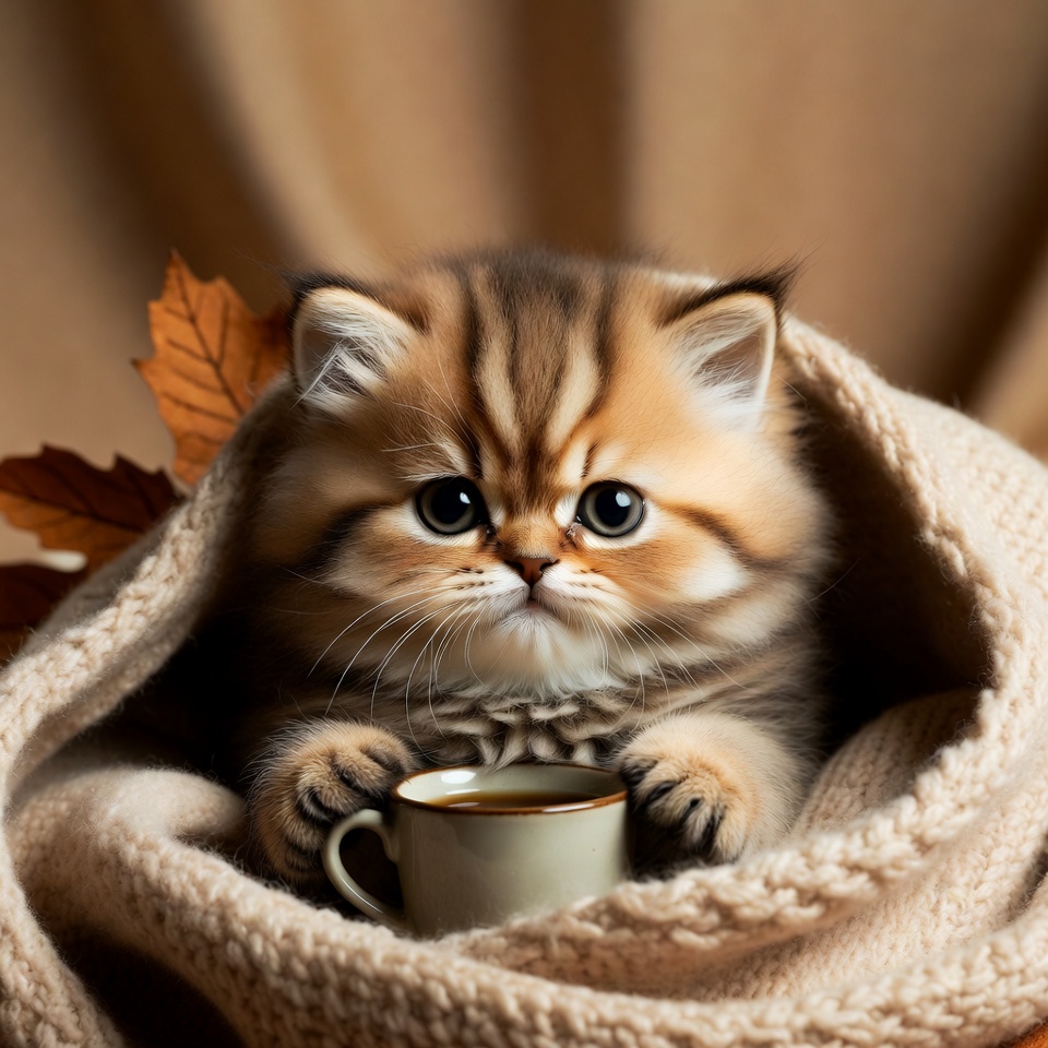 A small kitten sits wrapped in a blanket, holding a tiny cup. The setting has soft colors and gentle details that create a cozy scene.