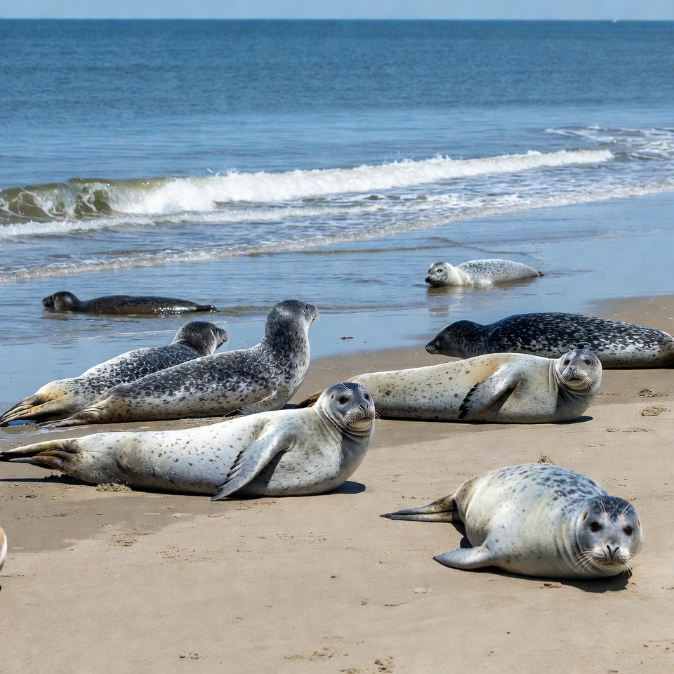 animal behavior, beach, coastal, marine life, natural habitat, nature, ocean, resting, sand, seal pups, seals, seaside, shore, shore birds, sunbathing, tranquil, water, waves, wildlife, wildlife watching