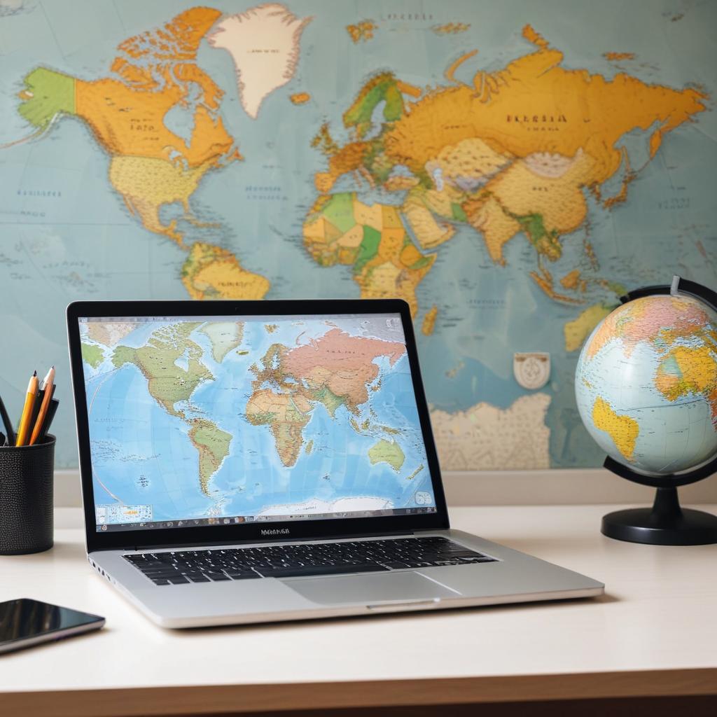 World map and computer workspace setup