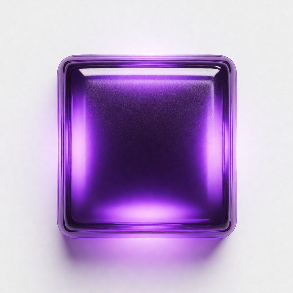 A purple square sits on a white surface. The object has a smooth surface and emits a soft glow, highlighting its shape.