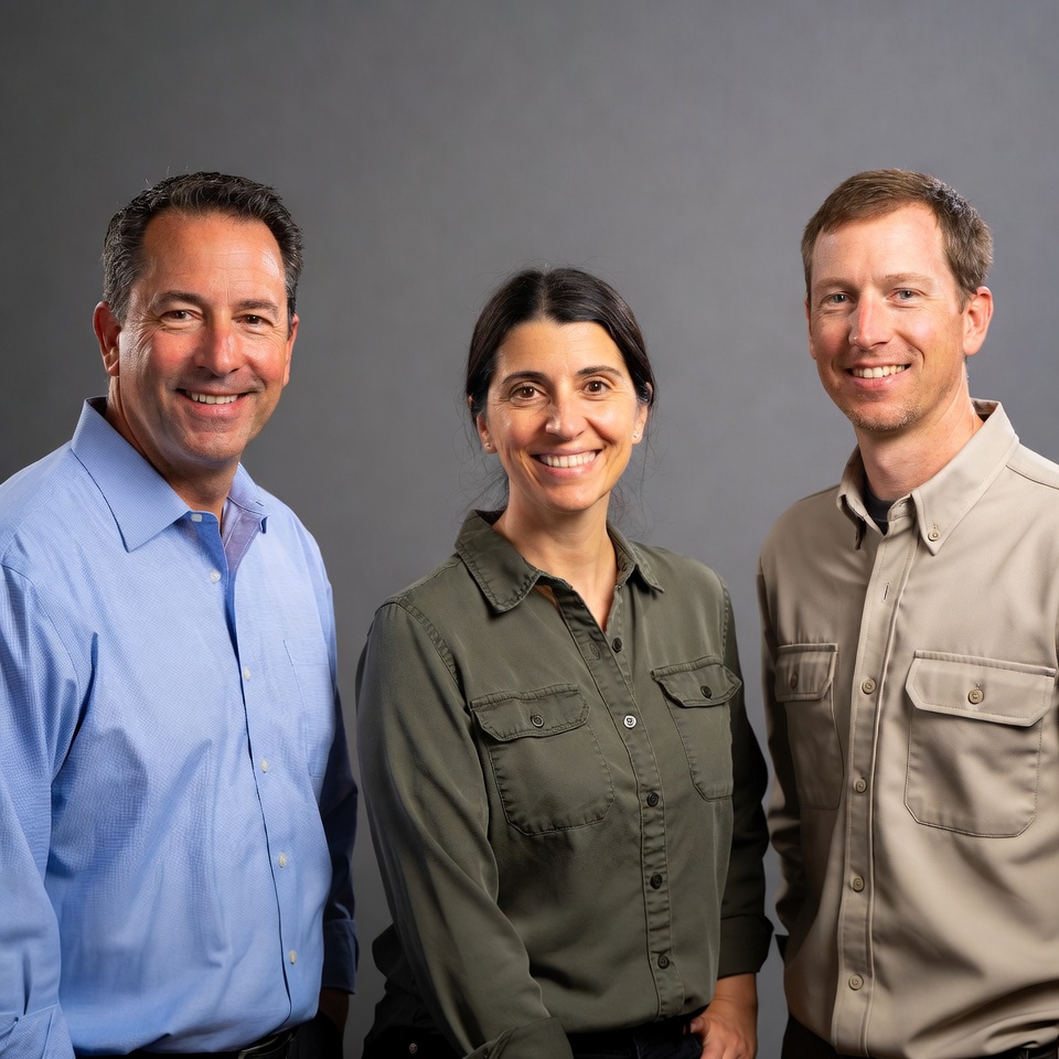 Three individuals stand together smiling in a studio. They wear different shirts and show a friendly demeanor during the photo session.