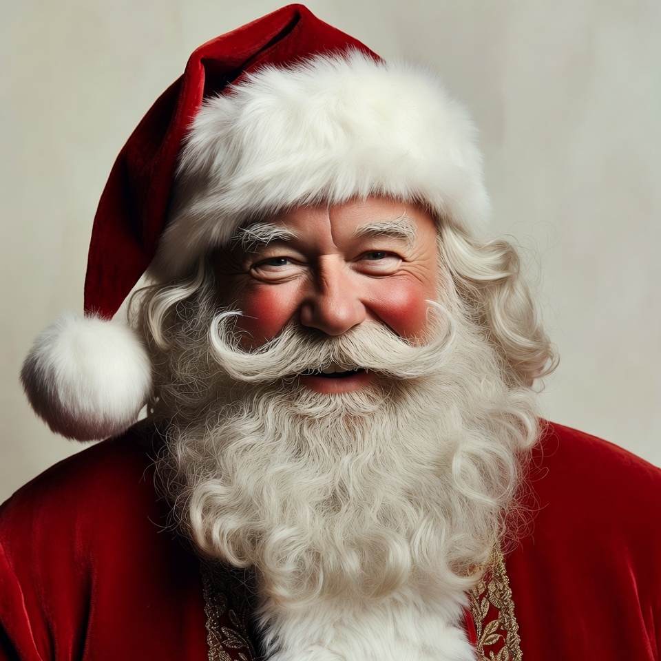 Santa smiles cheerfully with his white beard and red suit. He wears a hat and looks ready for the holiday season.