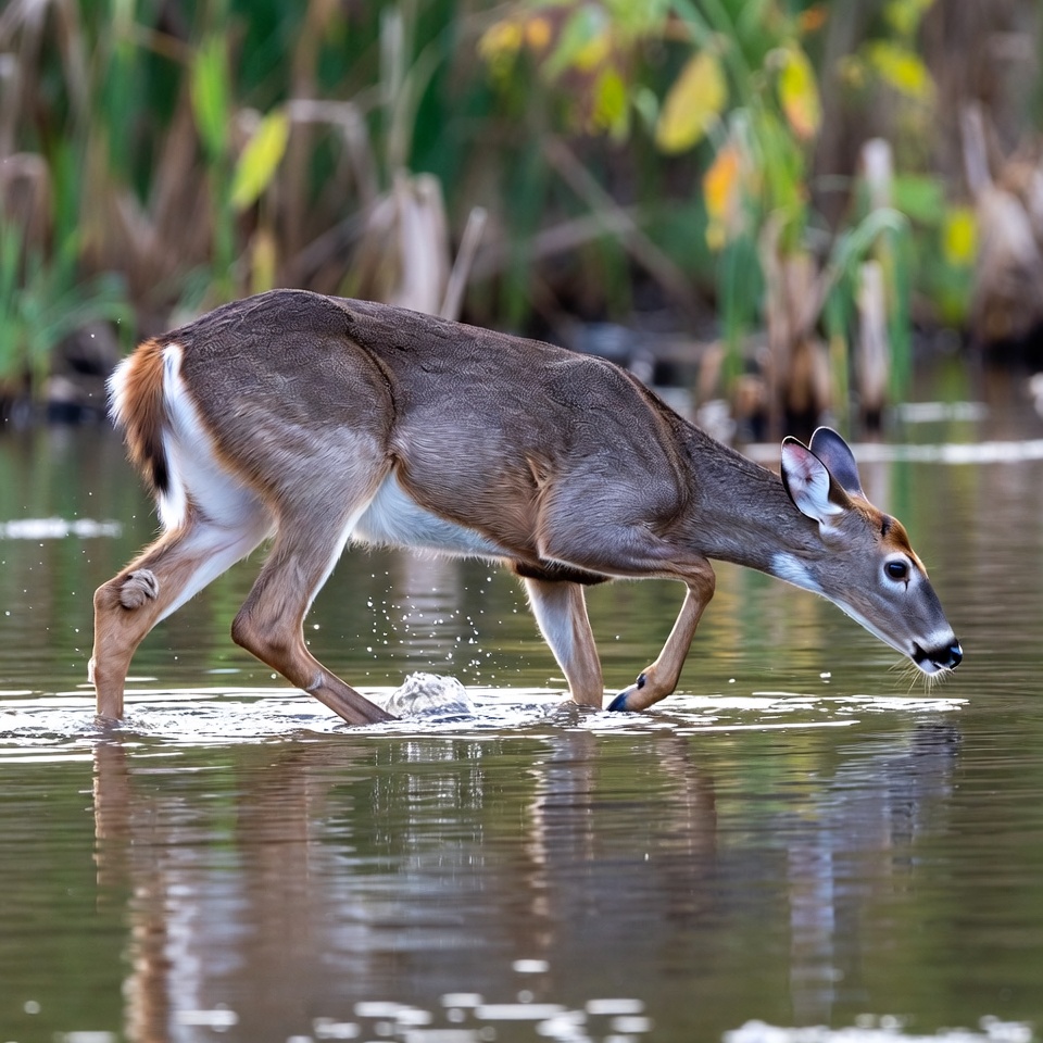 animal, animal behavior, deer, drinking, ecosystem, environment, forest, grass, habitat, landscape, nature, outdoor, peaceful, plants, pond, reflection, serene, water, wild, wildlife