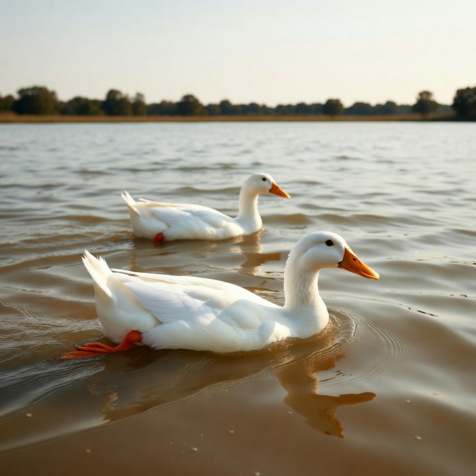 Two white ducks swim in the water during the late afternoon. Trees line the shore in the background under the clear sky.