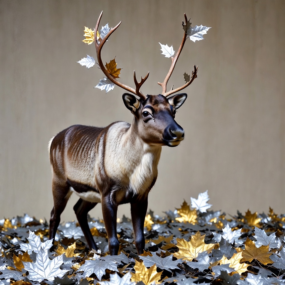 A reindeer stands on a ground of golden and silver leaves. It has antlers with some leaves stuck in them.