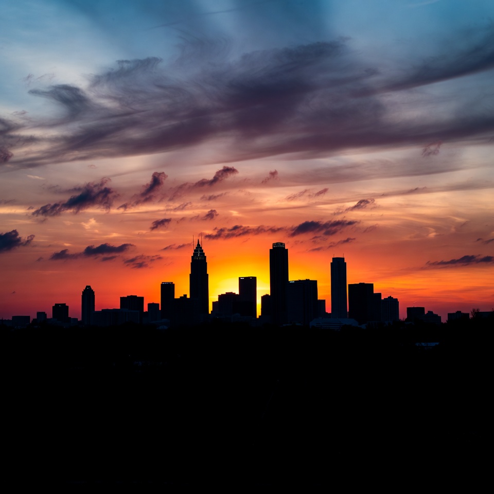 architecture, blue, buildings, city, clouds, downtown, dusk, evening, horizon, landscape, light, nature, orange, outdoor, silhouettes, sky, skyline, skyline view, sunset, urban