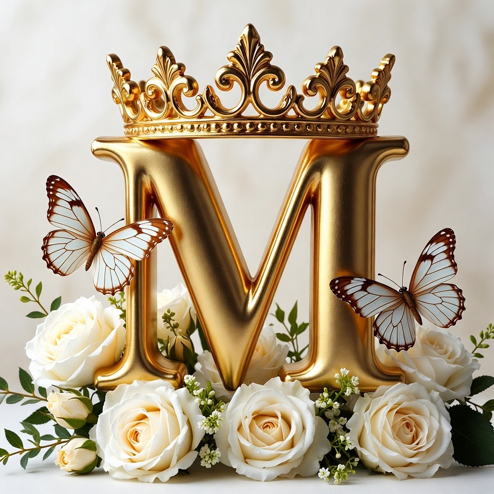 A large gold letter M sits in front of a crown with butterflies around it. White flowers surround the letter, creating a decorative display.