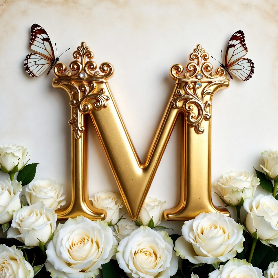 A large golden letter M sits among fresh white roses with butterflies resting on the sides. This scene shows a decorative arrangement.