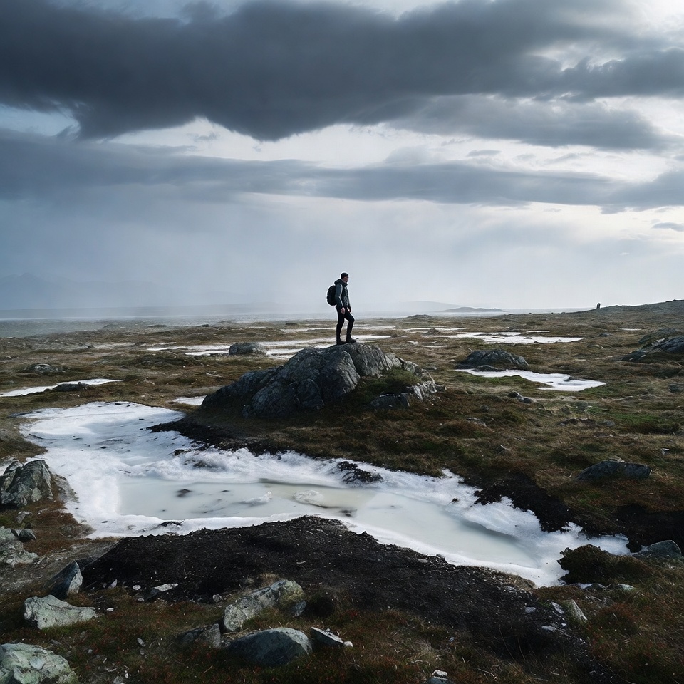 A person is on a rock in a rugged area. Clouds fill the sky and patches of snow are visible near the ground.