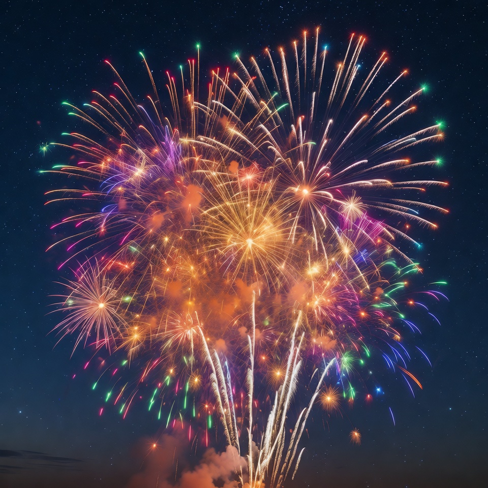 Colorful fireworks light up the night sky in a festive display. Different shapes and colors explode above, celebrating a special occasion.