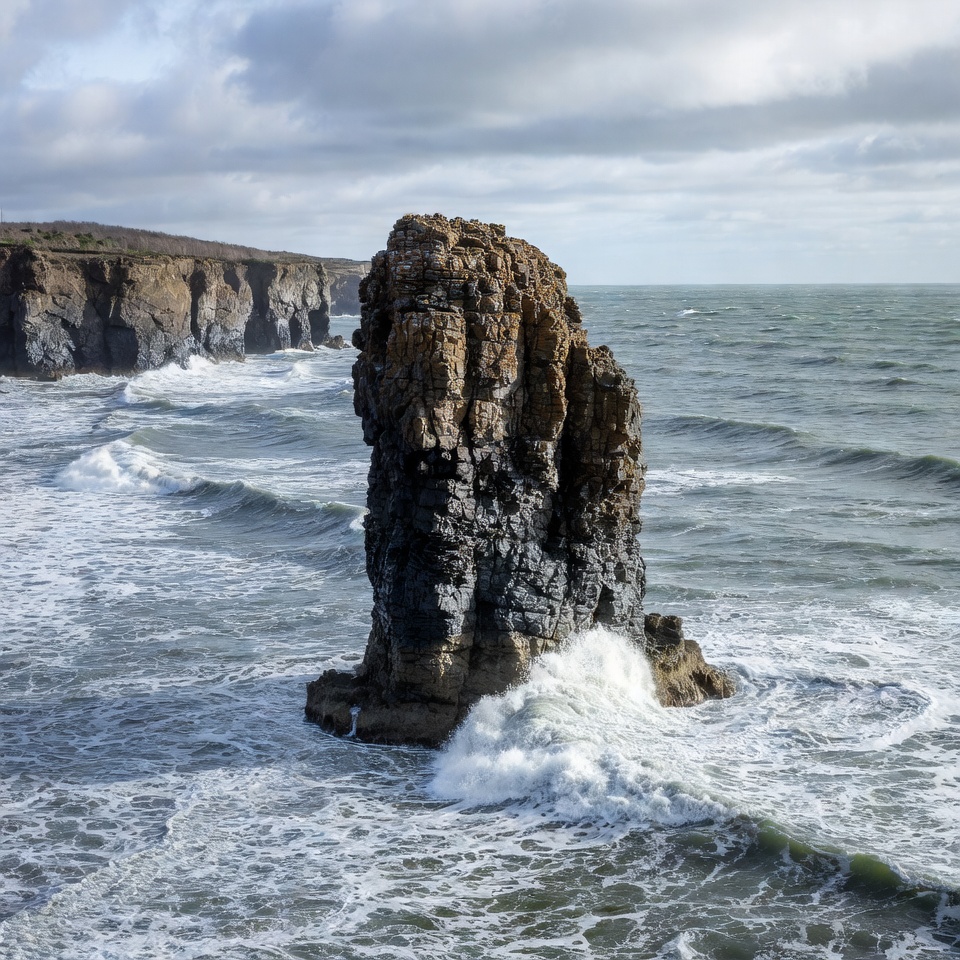 Waves crash against a tall rock formation near the coast on a cloudy day. The sea is rough and the cliffs are visible in the background.