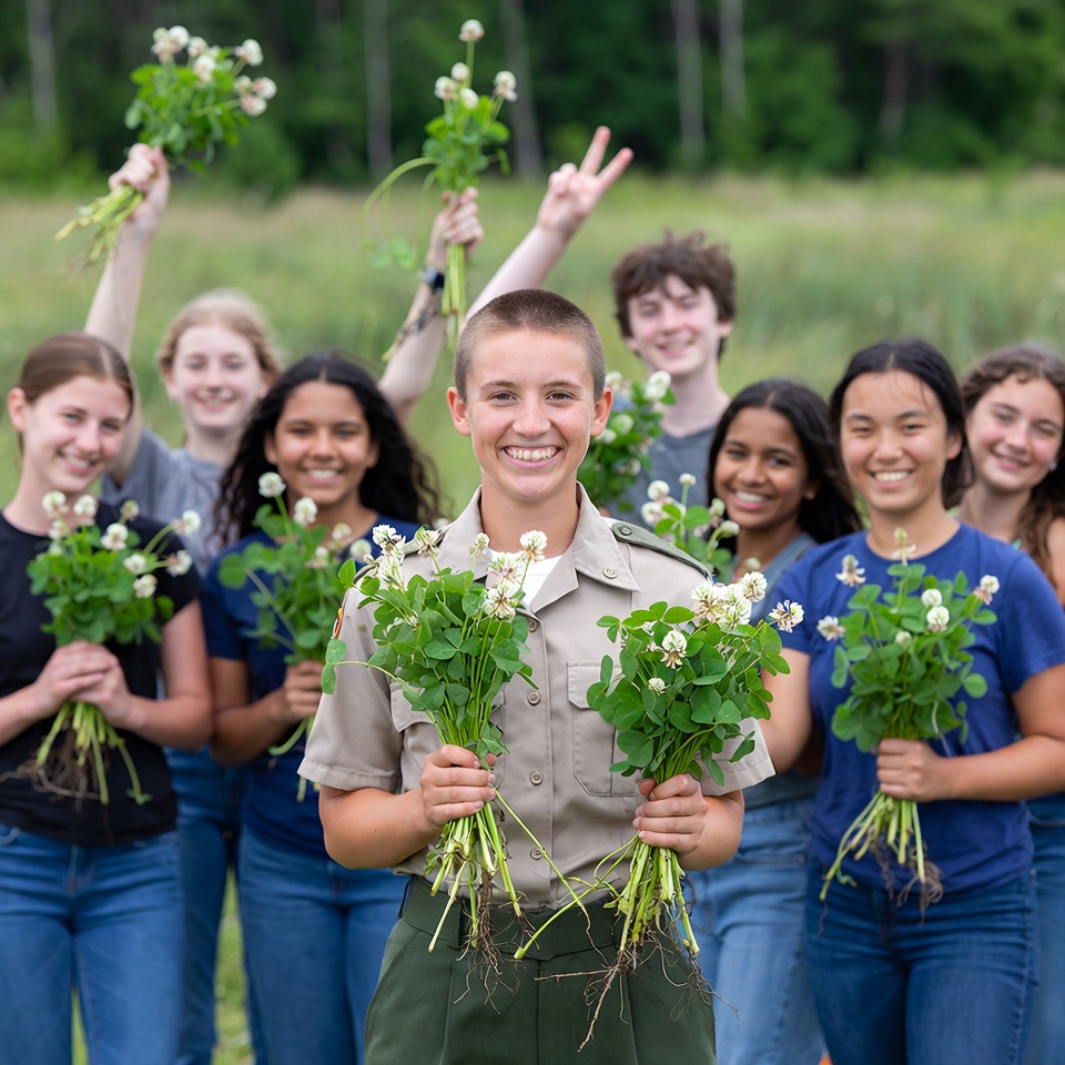 Students stand in a field, smiling and holding potted plants. They enjoy gardening and share a fun moment amidst greenery.