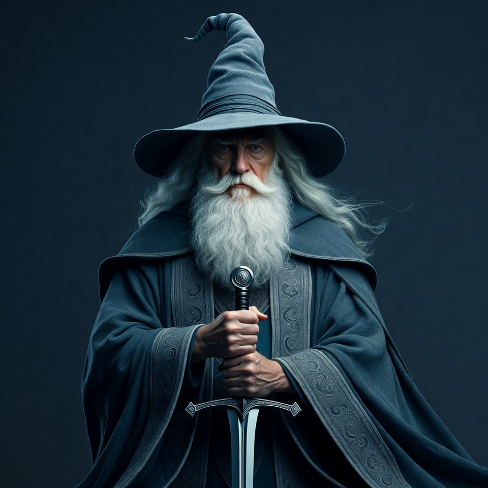 A wizard stands tall holding a sword. He wears a grey robe and a pointed hat. The background is dark, emphasizing his features and pose.