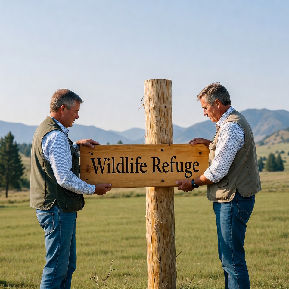 Two men work together to install a wooden sign for a wildlife refuge in a grassy field surrounded by mountains on a clear day.