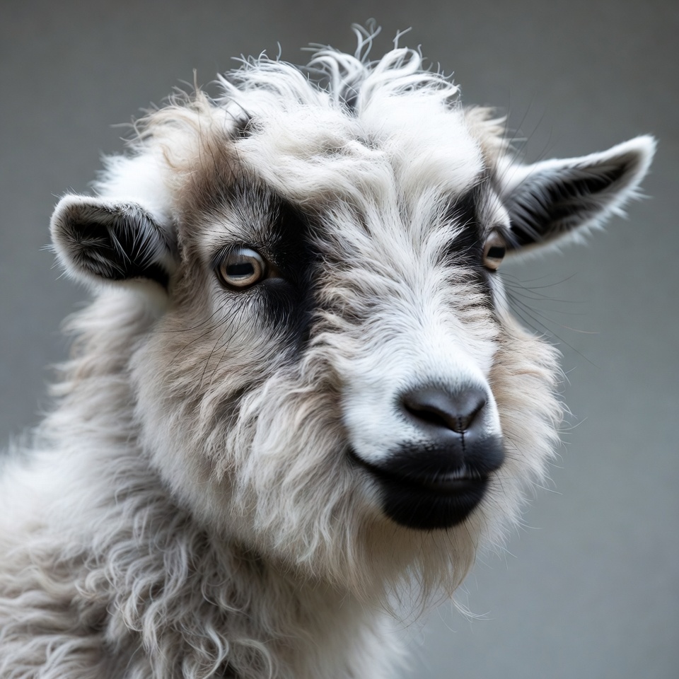 A young goat is looking directly at the camera. Its fluffy fur is mostly white with some gray. The goat has bright eyes and a curious expression.
