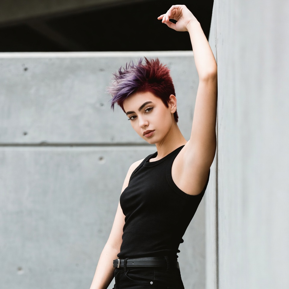 A young person leans against a gray wall in casual clothing. They are striking a confident pose with a unique hairstyle.