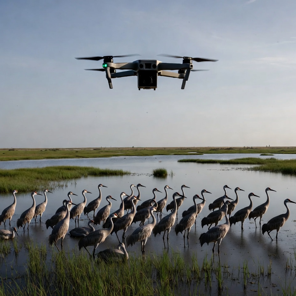 animal, animals, avian, bird, birds, cranes, drone, flock, flying, grasses, marsh, nature, outdoors, sandhill crane, shallow, sky, standing, water, wetland, wildlife