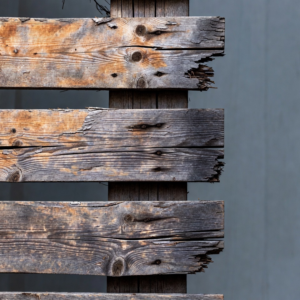 Old wooden boards show signs of wear. The surface has cracks and rough edges. Background features a plain gray wall.