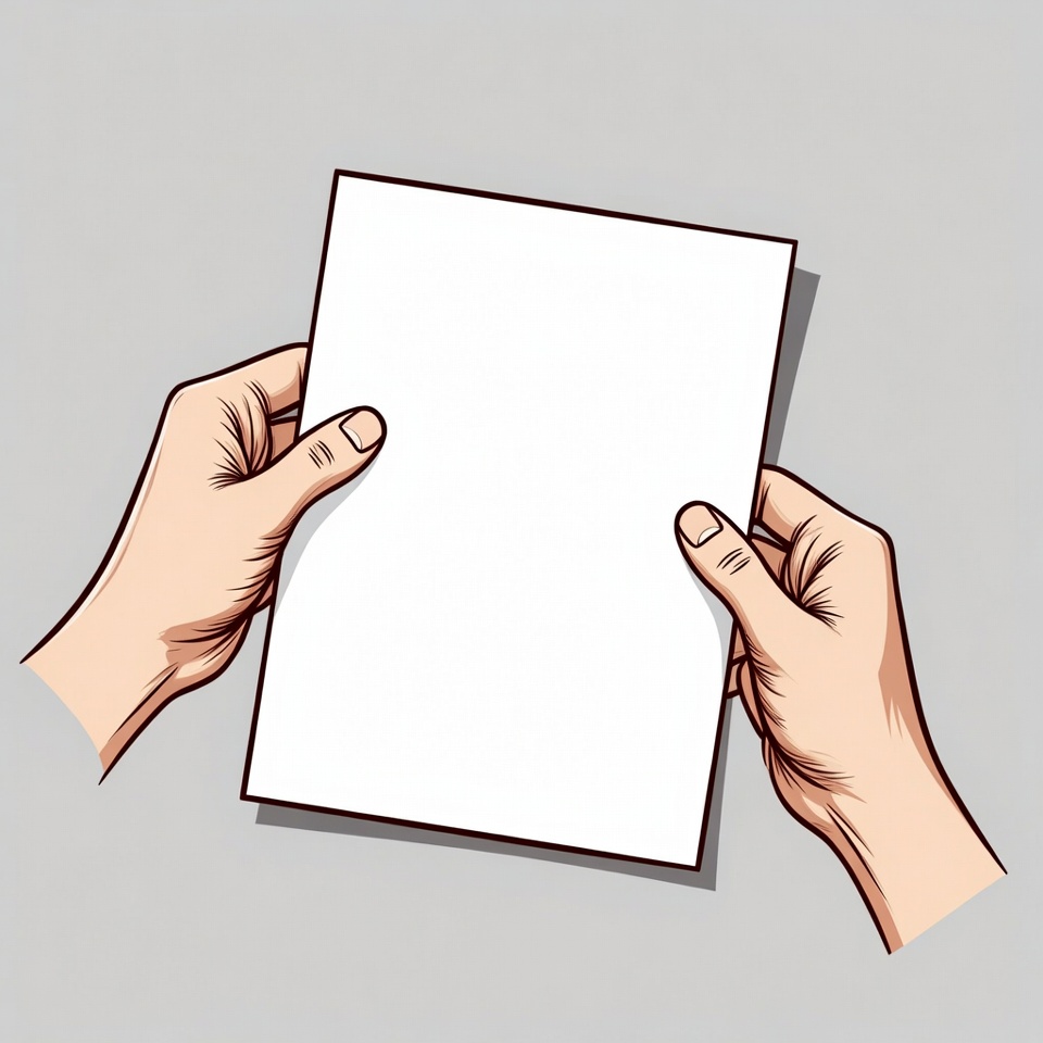 Two hands hold a blank sheet of paper against a gray background. The hands are steady and focus on the empty surface.